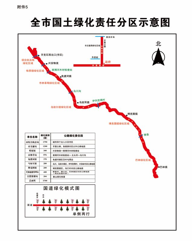 2020年全市共落实重点区域绿化任务5700亩,补助标准为1500/亩,项目总投资855万元。其中:交通局负责落实绿化面积1200亩,城管执法局负责落实绿化面积1790亩,林业和草原局负责落实绿化积876亩,自然资源局负责落实绿化积204亩,牧原镇负责落实绿化面积300亩,免渡河镇负责落实绿化面积370亩,乌奴耳镇负责落实绿化面积280亩,博克图镇负责落实绿化面积280亩,巴林旅游区管理局负责落实绿化面积400亩。具体绿化地块及标准按照上级批复的国土绿化造林作业设计、《造林技术规程》〈GB/T15776—2016〉《2019—2020年全市重点区域绿化任务分配表》《2020年国土绿化工作须知》为准。